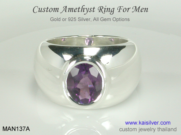 Men's big gemstone ring, you choose the gem of your choice. The ring is shown with a big amethyst gem and is ideally suited for gems like amethyst, red garnet, peridot, green jade, citrine, aquamarine, green tourmaline, rhodolite, moonstone etc. You could order a men's gold or 925 silver ring in all sizes ... more.