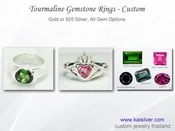 Tourmaline rings expertly handcrafted in Thailand. Kaisilver offers fine gold and silver tourmaline gemstone rings. Choose any tourmaline color, or pick any other gemstone of your choice. Thai gem experts custom cut each gem, your ring design or ours ... more.